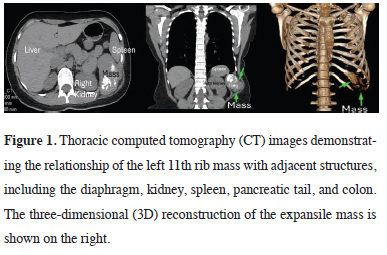 Figure 1: Thoracic computed tomography (CT) images demonstrating the relationship of the left 11th rib mass with adjacent structures, including the diaphragm, kidney, spleen, pancreatic tail, and colon. The three-dimensional (3D) reconstruction of the expansile mass is shown on the right. |
